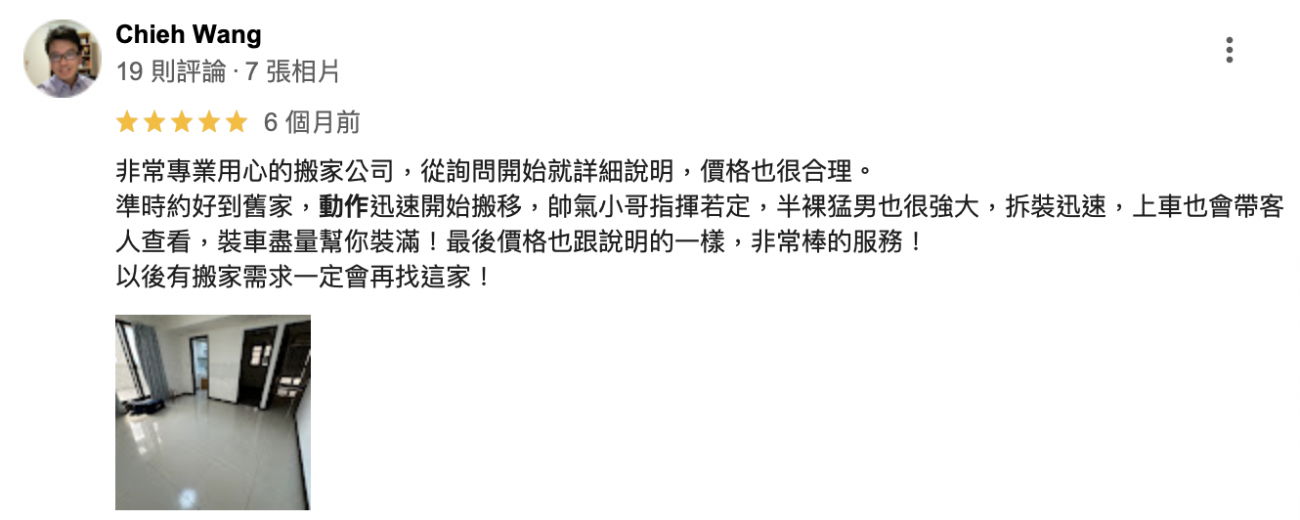 做事細心,搬家的動作敏捷,遇到需要脫鞋的房子也很有禮貌的配合